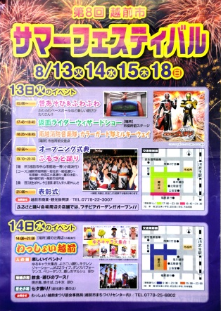 13日は午後5時45分から仮面ライダーショー、同6時25分からは南越消防音楽隊とカラーガード隊「ミルキーウェイ」の演奏がある。「ふるさと踊り」は同7時10分から。市役所前や蔵の辻など中心市街地一帯で、16団体の約2千人と華やかな山車7基が踊りの輪をつくる。
