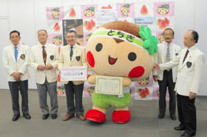 あまおう(苺)を飾ったベレー帽をかぶり、久留米絣の着物を着た女の子で、