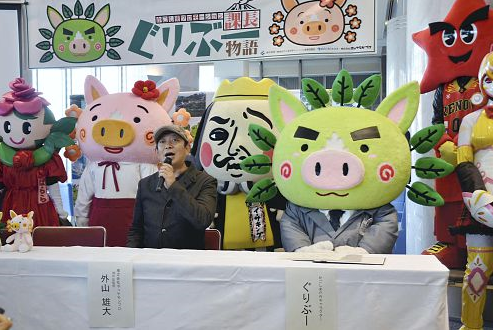 県庁で記者会見があり、出演する県内のゆるキャラ約40体が集結。ぐりぶーは「体が大きいから、部屋の出入りやエレベーターの乗り降りのシーンが難しかったぶー」と撮影の苦労について語った。製作総監督の外山雄大さんは「かわいいだけでなく、ゆるキャラが県民の間に根付くような作品に仕上げていきたい」と話した。