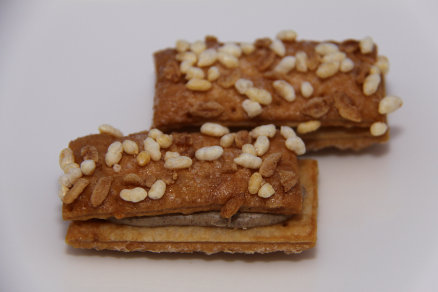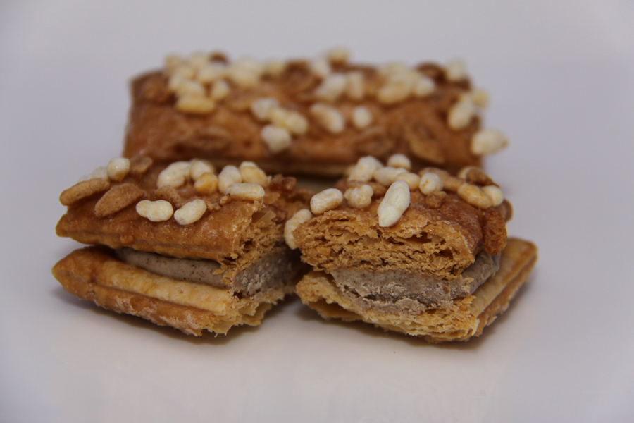 パイの表面にはお砂糖でコーティングされて、お米のパフが散りばめられていています。パイでサンドしているクリームはホワイトチョコに、はったい粉を混ぜ込んでいるそうです。