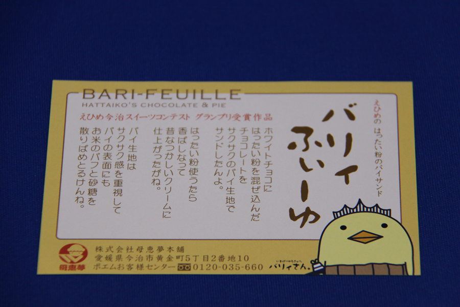 「えひめ今治スイーツコンテスト」のグランプリ受賞作品であることと、「はったい粉」を使ったパイサンドであることが書いてあります。 (はったい粉とは、大麦を炒って挽いた粉のことだそうです)