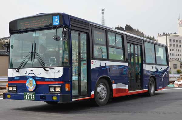 JR東日本は26日、大船渡線BRTに4月17日(木)から導入する観光型新車両・三陸の「海」号を報道陣に公開した。外観は濃い青色が基調で、内部には窓向き座席や大きな側窓を導入し、海沿いの景色を楽しめる。毎日上下各2便での運行を計画している。新車両導入は「乗って楽しい観光型」を狙った。気仙沼線BRTで走行していたディーゼル車を改造した。