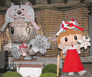 多賀観光協会のマスコットキャラクター「たがゆいちゃん」の巨大モニュメントが完成し、町役場正面で17日、「お披露目式典」があった。アルミ缶6万個を使い、高さは2・5メートルの堂々たる姿。町民ら400人が駆け付けて祝った。