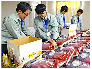 ・・・ 職員は7日、町役場で寄付者に送るコメの梱包(こんぽう)作業を行い、町のイメージキャラクター「あいづじげん」の描かれた段ボールにコメを詰めた。・・・