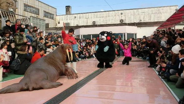 三重県伊勢市の水族館「二見シーパラダイス」に27日、熊本県の人気ゆるキャラ「くまモン」が登場し、同館の看板動物のセイウチ2匹とショーで競演した。