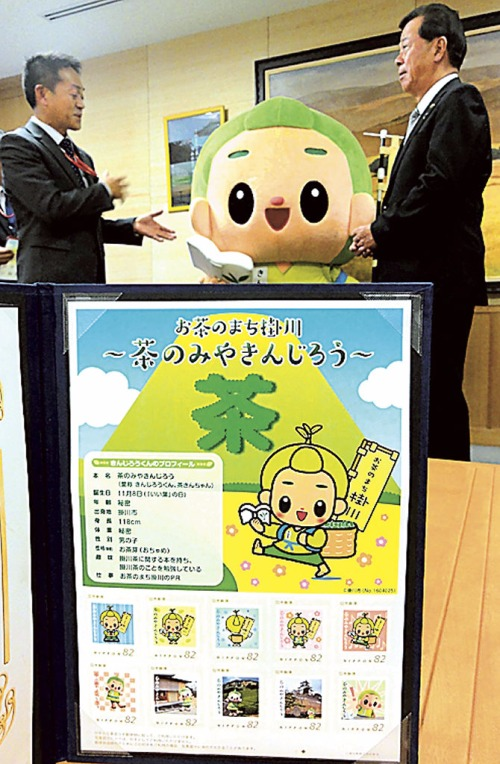 日本郵便東海支社は3日、掛川市のマスコットキャラクター「茶のみやきんじろう」をデザインしたオリジナルフレーム切手の販売を開始した。同市と磐田市、袋井市、御前崎市、菊川市、森町の全郵便局(一部の簡易郵便局は除く)で扱う。・・・