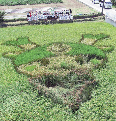 深谷市立川本南小の5年生41人が、地元農家らの指導を受けて、苗の育成から取り組んだ「ふっかちゃん」の田んぼアートが学校近くに完成。13日、地元住民が用意した高所作業車とドローンを使って上空からの・・・