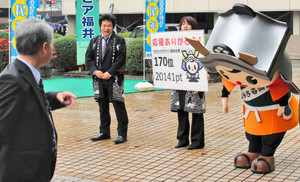 そろいの法被を着た関係者は、啓発ポスター全国審査で最高賞に輝いた西野ふうさん(福工大福井高一年)の作品を使ったチラシなどを配布。「朝倉ゆめまる」(福井市)や「湯巡権三(ゆめぐりごんぞう)」(あわら市)など県内のゆるキャラ五体や、県明るい選挙イメージキャラクター「めいすいサウルス」とともに、十二月二日公示の衆院選をPRした。・・・記事を読む出典:中日新聞