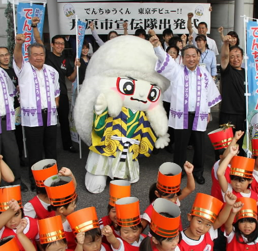 井原市のゆるキャラ「でんちゅうくん」が3日、東京・国立劇場で同日始まった歌舞伎公演「春興鏡獅子(しゅんきょうかがみじし)」で市をPRするため上京した。4日から公演終了の27日まで、ロビーで観客を出迎える。 でんちゅうくんのモチーフは、井原市生まれの木彫の巨匠、平櫛田中(ひらくしでんちゅう、1872~1979)の代表作「鏡獅子」。今回の公演では市川染五郎が鏡獅子を舞う。この日朝、井原市役所玄関であった宣伝隊出発式で、滝本豊文市長は「井原市を全国にPRするまたとない機会」とあいさつした。