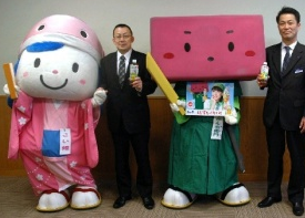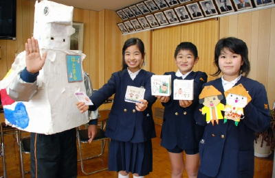 西与賀公民館が4月に公募し、町内の小学生から60歳代まで51人の応募作の中から、成穎中2年の原口なつきさん(14)と池田美咲季さん(14)のデザインが選ばれた。実際に「にっしー」を目にした2人は「かわいく作ってもらってうれしい。町の活性化のために活躍してくれれば」と喜んでいた。