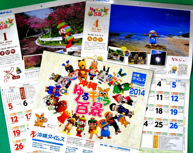 沖縄タイムス販売店会県連合会(前里暢哉会長)はこのほど、2014年オリジナルカレンダーを発行した。今回のテーマは「沖縄ゆるキャラ百景」。県内各自治体の「ゆるキャラ」が各地の名所や特産などを紹介している。本紙読者や新規の購読者には販売店を通じて無料で配布するほか、販売(1050円)もする。 問い合わせは、各販売店または沖縄タイムス読者局
