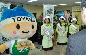 来春に魚津市で開催される全国植樹祭の機運を高めるPRキャラバンの任命式が十九日、県庁であり、県マスコットキャラクターのきときと君が隊長に就任した。