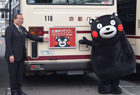 熊本地震の被災地に支援金を寄付した京福電気鉄道(京都市中京区)とグループ会社の京都バス(右京区)にこのほど、熊本県のPRキャラクター「くまモン」が訪れ、感謝の気持ちを伝えた。・・・