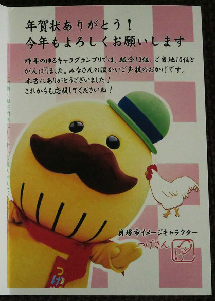 紅白の背景に「つげさん」の写真とニワトリがデザインされていて、「年賀状ありがとう!今年もよろしくお願いします」・「昨年のゆるキャラグランプリでは、総合13位、ご当地10位とがんばりました。みなさんの温かいご声援のおかげです。本当にありがとうございました!これからも応援してくださいね!」というメッセージが添えられていました。