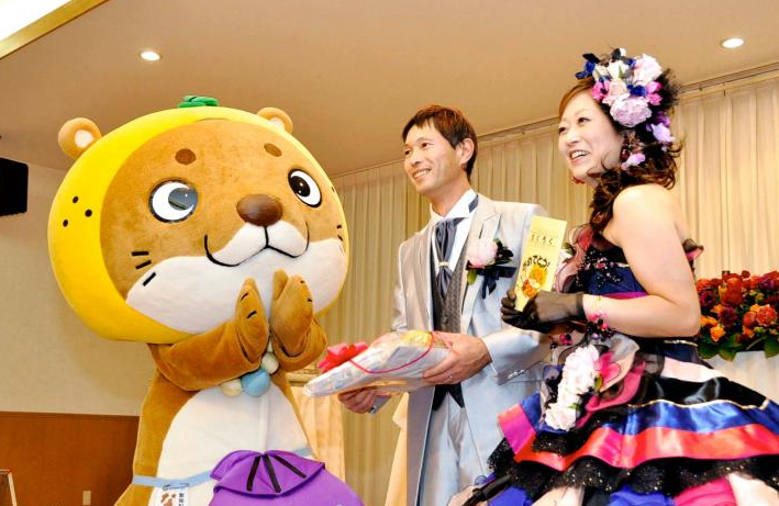 なーしくんは国の天然記念物ニホンカワウソをデザイン。頭に愛南ゴールドの帽子をかぶり、真珠のネックレスとヒオウギ貝のポシェットを身に着け、尻尾には相棒のカツオの「かっちゃん」がかみついている。