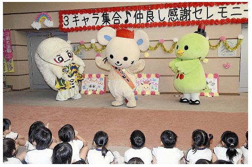 セレモニーでは、計約1500体が挑んだ同GPの総合順位で全国67位だった「チュッピー」、74位だった「でんちゅうくん」の結果報告もあり、片岡市長が「選挙戦並みに行った運動成果が出た」と話せば、滝本市長も「次回は負けない」と対抗心をあらわにしていた。