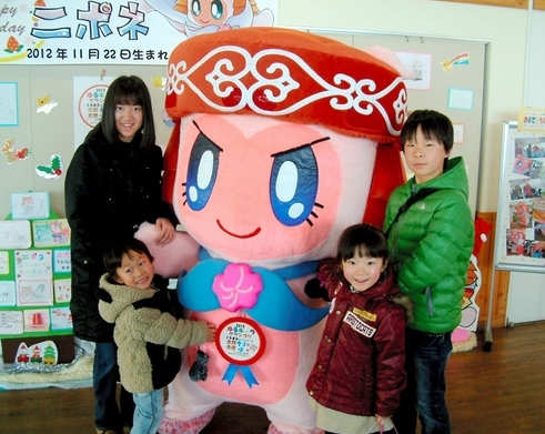 【網走】網走のゆるキャラ「ニポネ」の2歳の誕生会が24日、道の駅流氷街道網走で開かれ、集まった子どもら約100人が祝福し、ふれ合いを楽しんだ。
