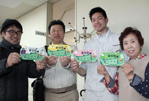 幕別町役場では、十勝初の原動機付き自転車用の「ご当地ナンバープレート」の交付が始まった。前夜から並んだ人もおり、早速、町のキャラクターが描かれた新プレートを手に入れた。