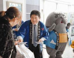 流氷をイメージした法被を着ていて、頭には大好物の帆立が乗っています。