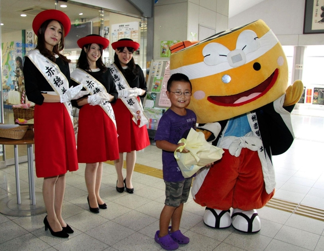 兵庫県の赤穂の観光PRキャラクター「陣たくん」の3歳の“誕生日”を祝う催しが22日、赤穂市加里屋の赤穂観光協会前で開かれた。