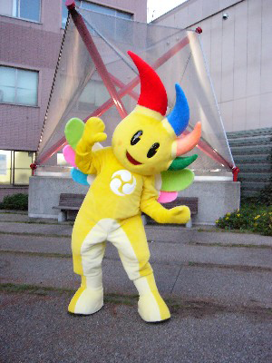 Happy花笠をかぶった「ハネトン」・青森りんごを被っているのが「あぷたん」・